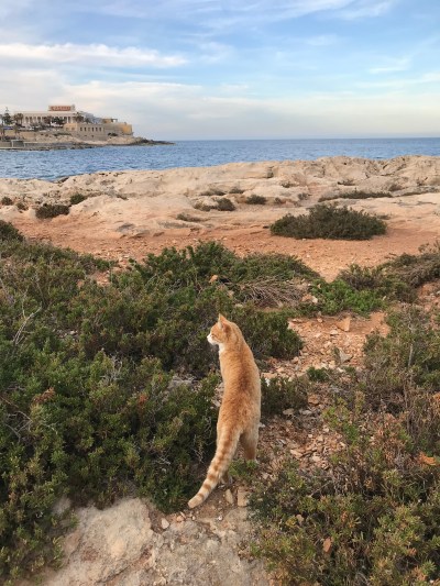 On a brighter note, the cats were the focus of some of my favourite photos I took whilst in Malta. A touching moment where I saw a cat hanging around a local fisherman, waiting for his catch! I asked the fisherman if he would share with the cat, to which he said yes. This scenario is reflected in a very sweet statue by Spinola Bay. It seems that the cats are part of the culture and I like to envisage them as ‘guardians’ of the city as they are everywhere you turn. You will even see them wandering around by the rock beach at Saint Julian’s (aka San Giljan). So without much ado, here are some photos: